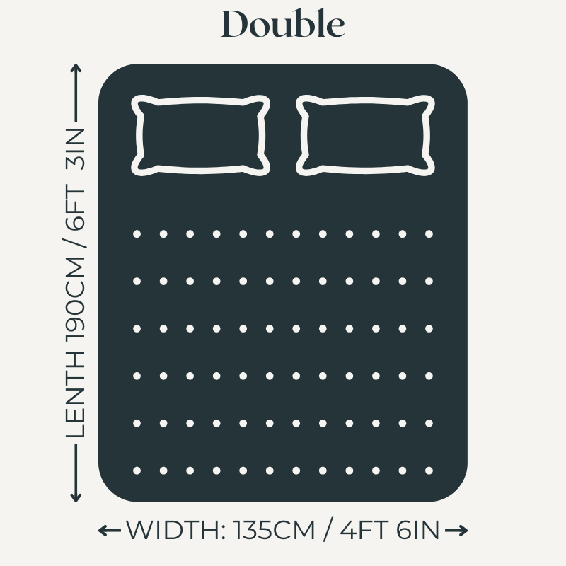 Double: Dimensions are 135cm x 190cm (4'6" x 6'3"). A popular choice for couples or individuals who prefer more space to stretch out while sleeping.