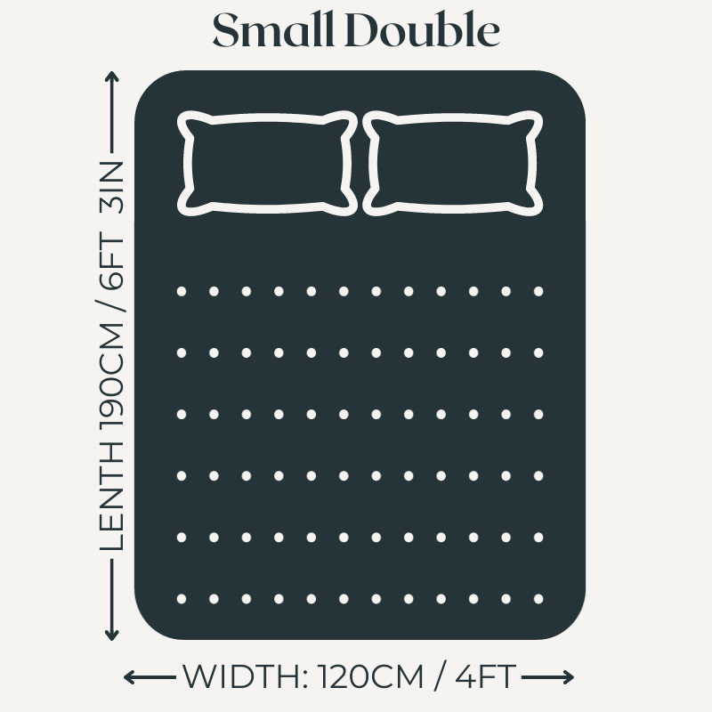 Small Double (Queen): Dimensions are 120cm x 190cm (4'0" x 6'3"). Also known as Queen size, this mattress offers extra width compared to a single, providing more sleeping space for one person or comfortably accommodating two.