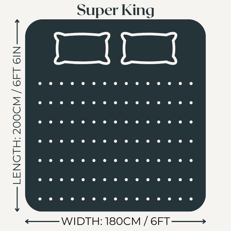 Super King Size: Dimensions are 180cm x 200cm (6'0" x 6'6"). The largest standard size available, providing plenty of space for couples or individuals who value spaciousness and luxury.
