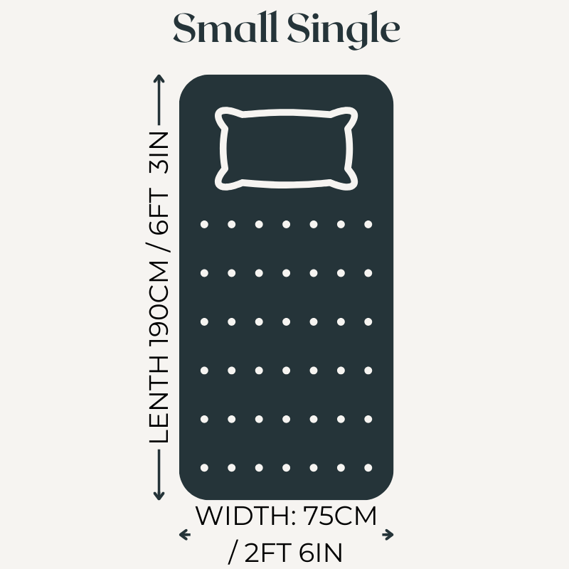 Small Single: Dimensions are 75cm x 190cm (2'6" x 6'3"). This size is suitable for narrow spaces or as a space-saving option in children's bedrooms, guest rooms, or smaller bedrooms where space is limited.