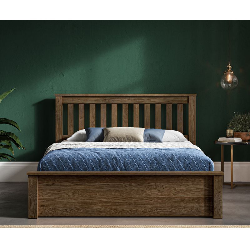 The distinctive slat headboard design of the Monaco solid oak ottoman bed introduces an element of elegance and character, making it a captivating addition to any bedroom. The bed's solid oak construction and gas lift frame provide a robust and secure foundation for your mattress, ensuring a comfortable and rejuvenating sleep.