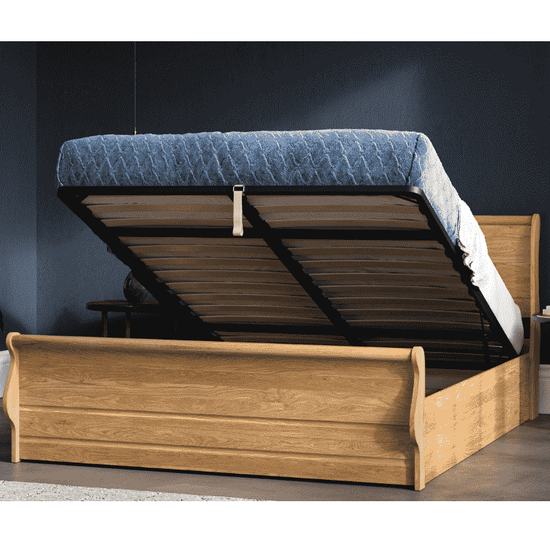 The gas lift mechanism provides an easy means to lift the bed, unveiling a capacious storage area that is a perfect solution for maintaining a tidy and clutter-free bedroom. The bed's high foot end boasts a captivating sleigh design, adding a distinctive personality to the piece and instilling a timeless sense of grace and charm.
