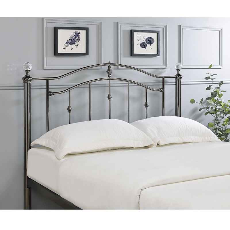Crafted to perfection, the CALLISTO bed frame boasts a striking chrome finish that exudes opulence and refinement, adding a touch of glamour to any bedroom décor. For those seeking an extra touch of sparkle, the bed frame comes with the option of both Crystal and Chrome finials, allowing you to customize your sleeping haven to reflect your personal style and preferences.